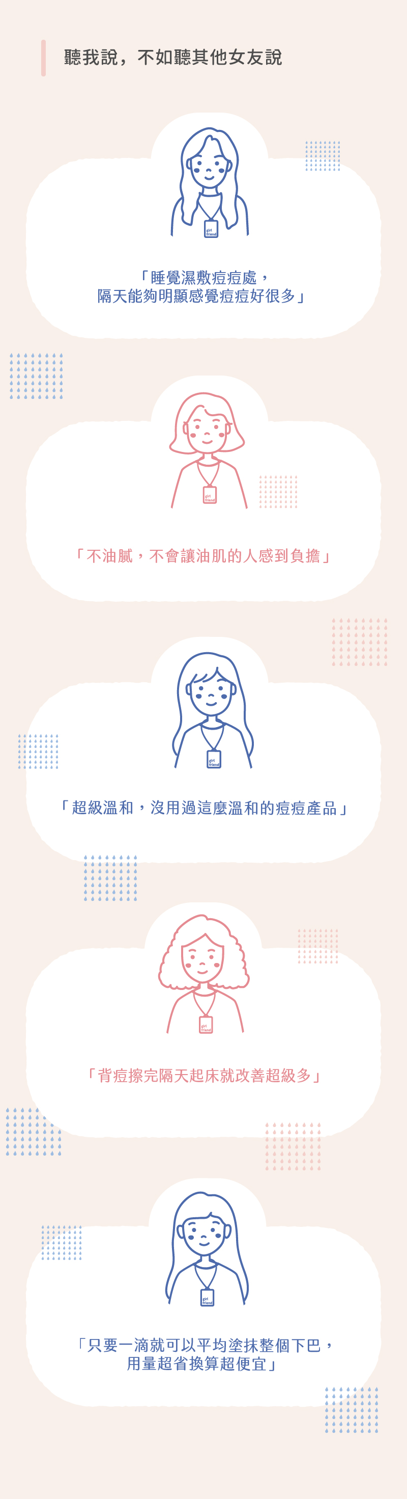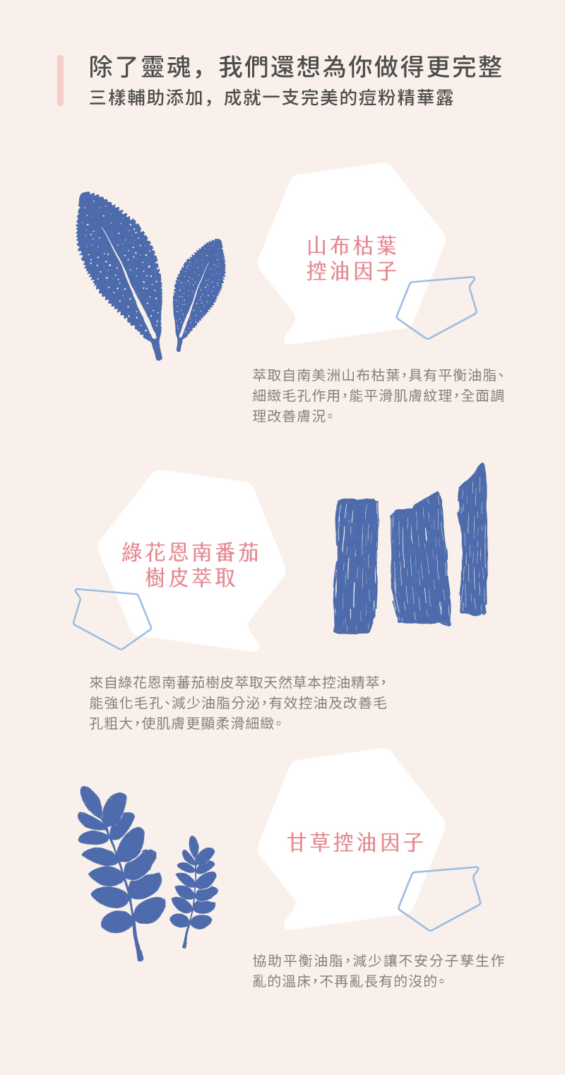 針對痘痘:高濃度抗菌成分,直接針對致痘的痤瘡桿菌做處理(消滅)