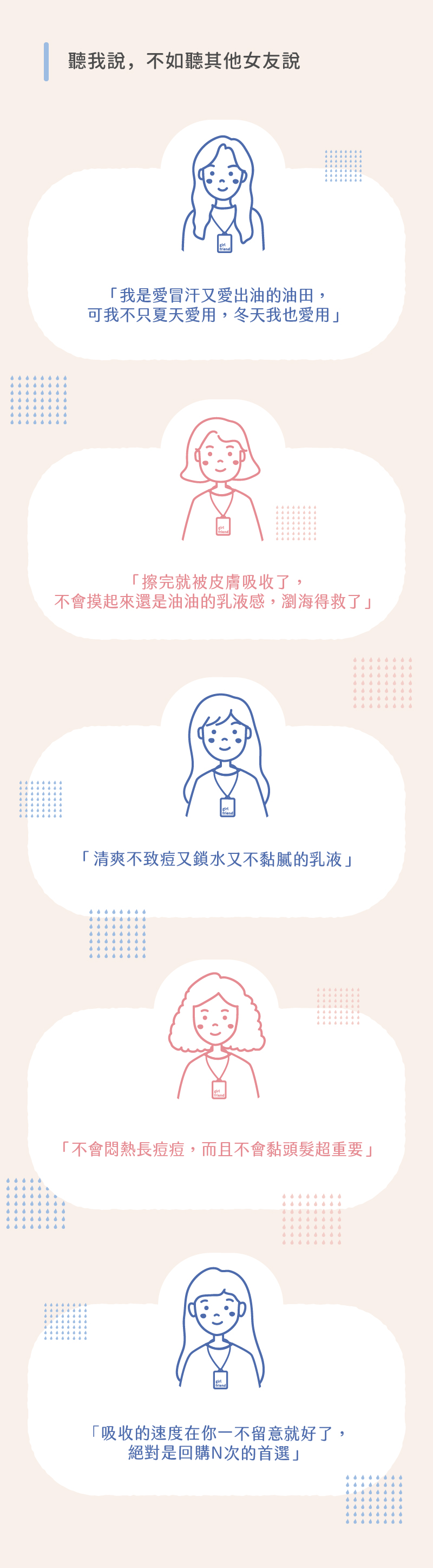 A:清爽好吸收,不會有悶感及膜感,擔心過度滋潤長痘,T字部位及易出油處薄擦帶過即可。